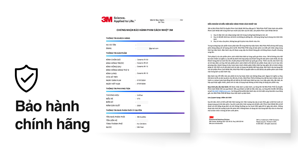 Mỗi mã phim mà 3M đưa ra thị trường đều đi kèm số series riêng, chứng nhận nguồn gốc rõ ràng. Tại NanoFilm, Phim cách nhiệt ô tô 3M™ sẽ được bảo hành điện tử 10 năm, do chính hệ thống toàn cầu của 3M quản lý. Bảo hành bao gồm các lỗi kỹ thuật hoặc lỗi phim như: bong tróc, rạn nứt hay loang màu. Không bảo hành lỗi do người sử dụng gây ra.